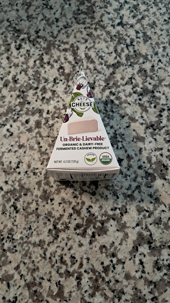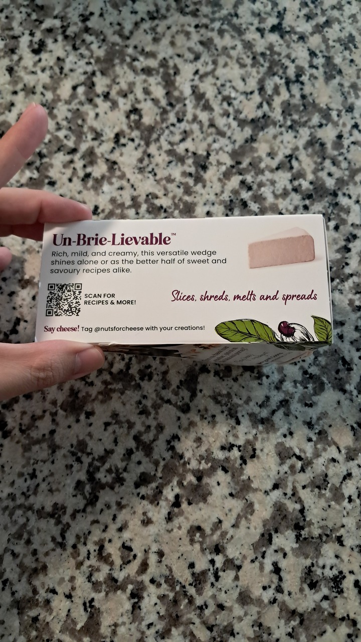 I bought a slice of Brie "cheese" by Nuts for Cheese. Pricing of 4.99 dollars for a 120g piece, this cheese was twice as expensive as a President Brie wheel of over 200g. First look was that the paper box was quite catchy and nice.