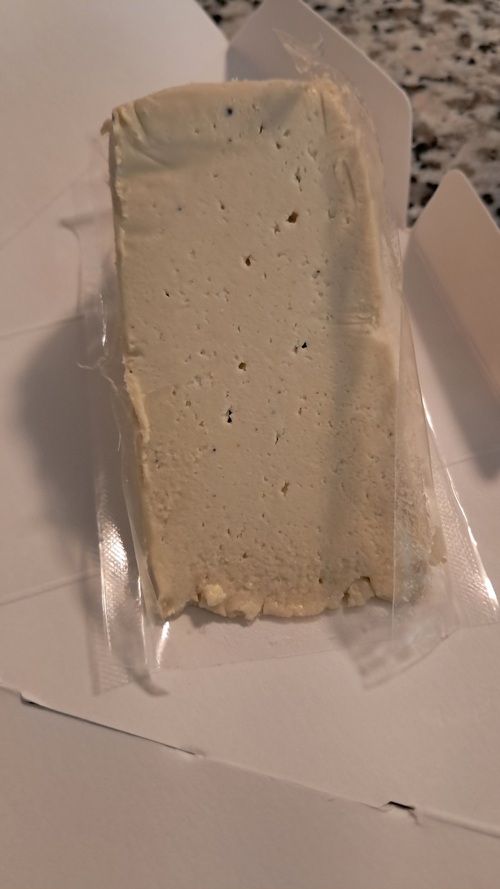 Opening it up showed us that piece of cheese. Unlike a real piece of Brie, it did not have a rind and a middle creamy cheese. Instead, it was a uniform gray cheese. Slicing a piece for testing, it tasted tangy, salty, had a hint of cheese and fermentation smell. So of course it tasted nothing like Brie, it was more "Cheddar" clone because of how salty it is. I guess the salt is to cover up the fact this is not a cheese. I tried various vegetarian dishes in the past. A lot of those used lots of salt and spices to cover up the vegetable flavor, too. I would appreciate it if they just not add so much salt.
