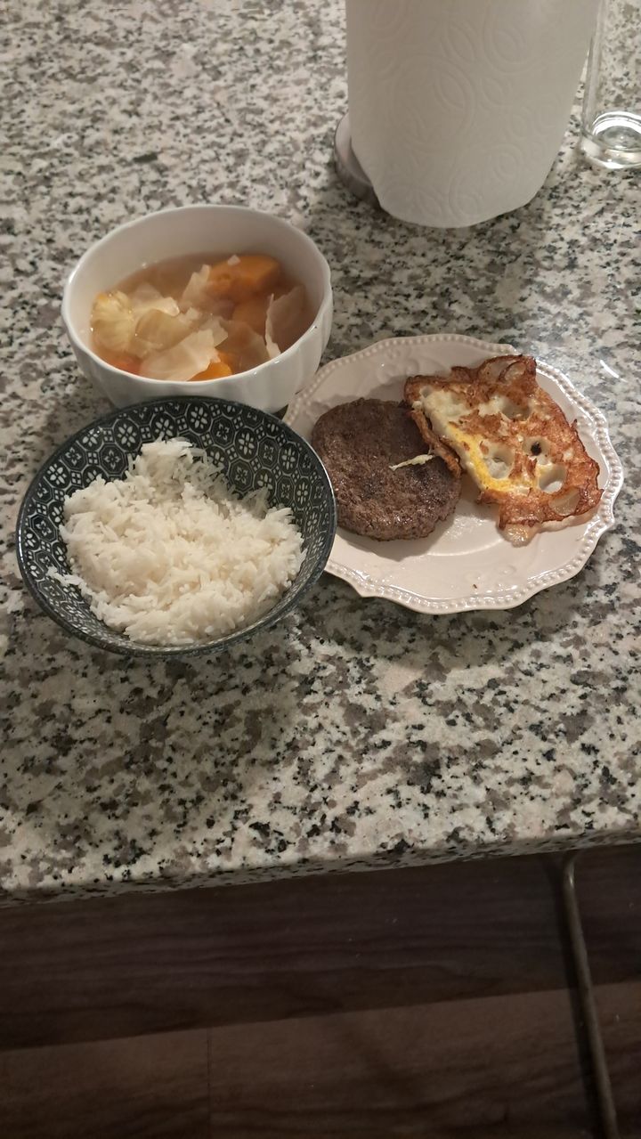 This one was the Hamburg steak I fried with my stainless steel. Turns out 20% fat inside a beef patty is quite a lot of fat, so I didn't really need a lot of oil. Taste like browned steak but juicier, not as tough. With a meat thermometer, I didn't have to worry about meat not cooking through, so I cooked it for 10 minutes at medium-low temperature.