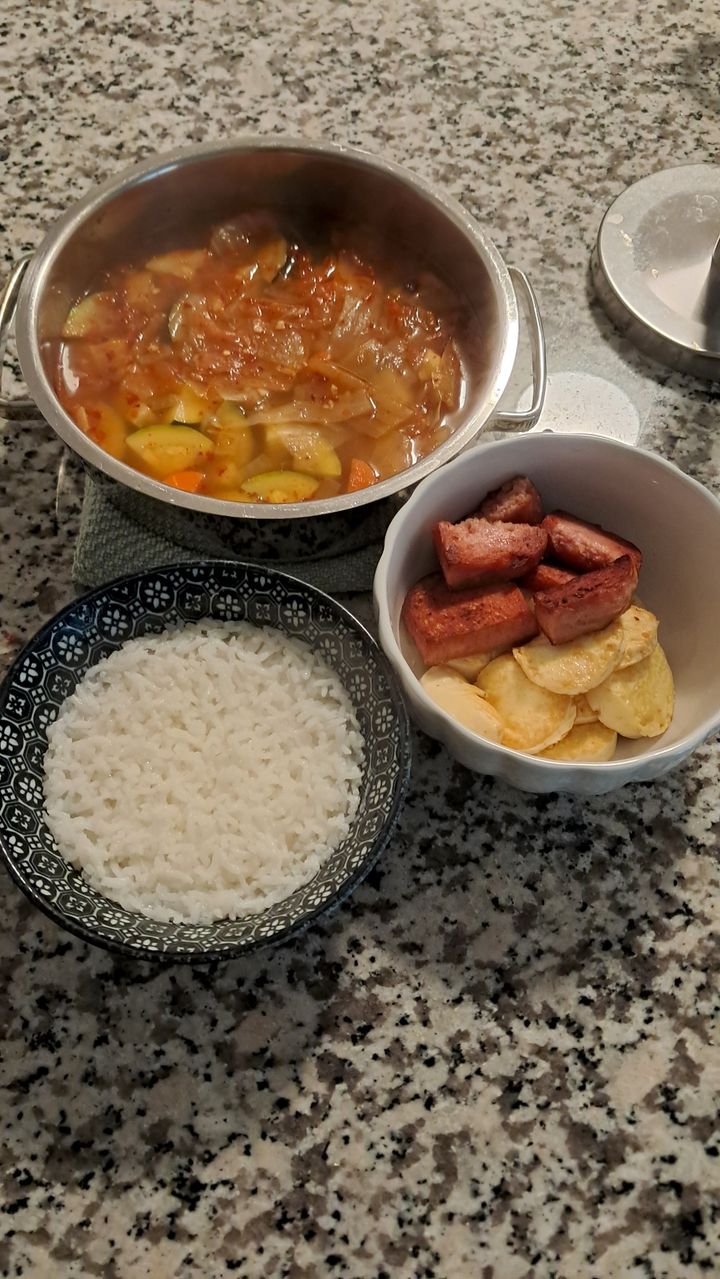 Anyway, I have been doing a lot of frying. Pictured below are kimchi-jjigae, also known as kimchi stew. I quite like the taste of kimchi, but it only serves as a flavor, not the main focus because it's too salty and spicy. The first one, I fried some Spam and egg tofu. You have to try it, it's delicious, fatty. But I had to use a nonstick pan because of the tofu. Fry the egg tofu long enough, it became crunchy like an actual fried egg. Spam when fried gave out a savory, tasty new flavor.
