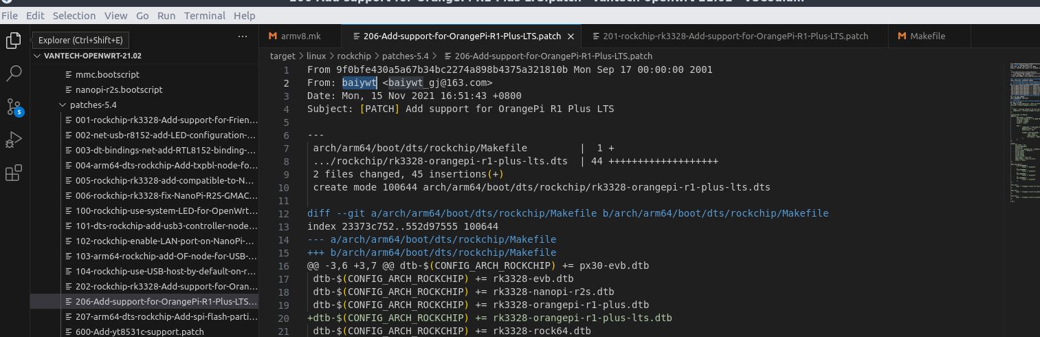 - The .patch files inside target/linux/rockchip/patches-5.4 and package/boot/uboot-rockchip/patches. According to kernel.org, these are kernel patches. This is how Orange Pi add support for their R1 Plus (and LTS) board to OpenWrt, even though you can't find this board on OpenWrt's download page. They patched dts files in the kernel, in addition to the YT8531C driver for the ethernet.