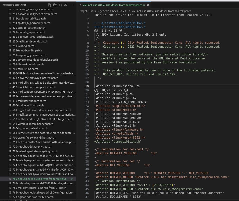 I first tried using /dev/null as source to diff against r8152.c file from Realtek, and then put it in as patch. I deleted a patch related to r8152.c so it remained original to kernel source. I put the patch in target/linux/generic/hack-5.15, same as where I deleted the previous patch. But replacing the kernel driver wasn't easy, I tried