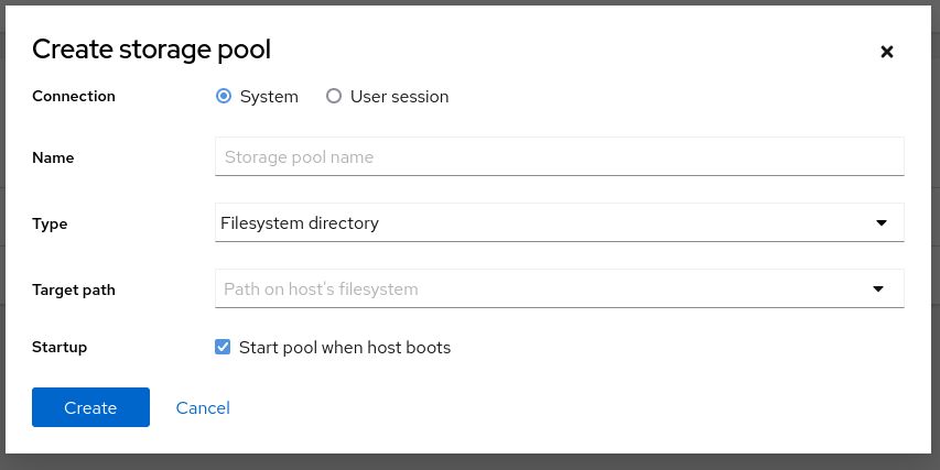 Next, I need to set up a storage pool. In Cockpit, a storage pool makes sense for hard drives, not really for disk images, because they would ask you to show them the location of the ISO file, regardless of it belonging in the pool.