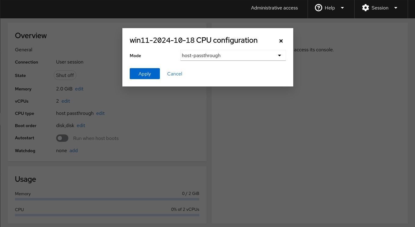 One last thing. Make sure the CPU type is host-passthrough for the best performance. According to