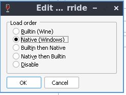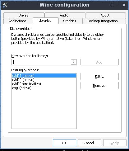 After that, open the terminal and type winecfg. With the interface, add these files in the dialog to override the default of Wine. With each file, edit it to have Native (Windows) order.